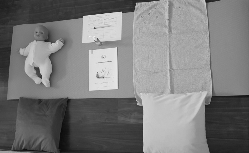 Je ne masse pas votre enfant, c'est vous qui le faites afin de renforcer votre connexion et votre lien d'attachement avec lui. Je vous montre les mouvements à effectuer sur une poupée.